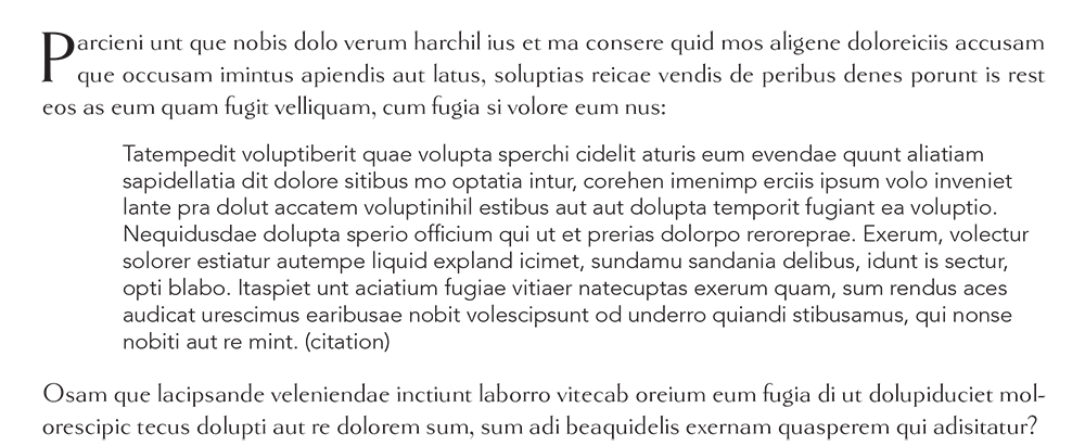 While quotations may, of course, be run into the body of the text, the block quote allows the reader to easily differentiate words that are not original to the text. The quotation is integrated into the flow of the text, meaning it should read seamlessly as one. There is no need for quotation marks (“ ”) in this format.