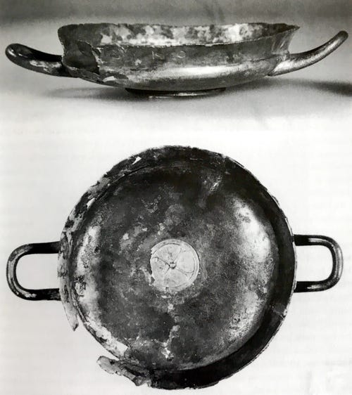 In the story, Antisthenes is a Hellene living among the Skythians who plays a central role in the story. His own story is complicated, and he is a somewhat inscrutable figure both to the reader and to his fellow characters, so I thought it only fitting to tie him to an artifact with an equally enigmatic history. His name comes from a silver kylix found in the Solokha mound which bears two separate and nearly illegible inscriptions:
